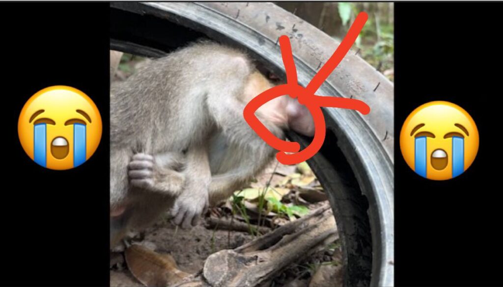 A parked car wheel with small gaps can easily trap a baby monkey’s head.